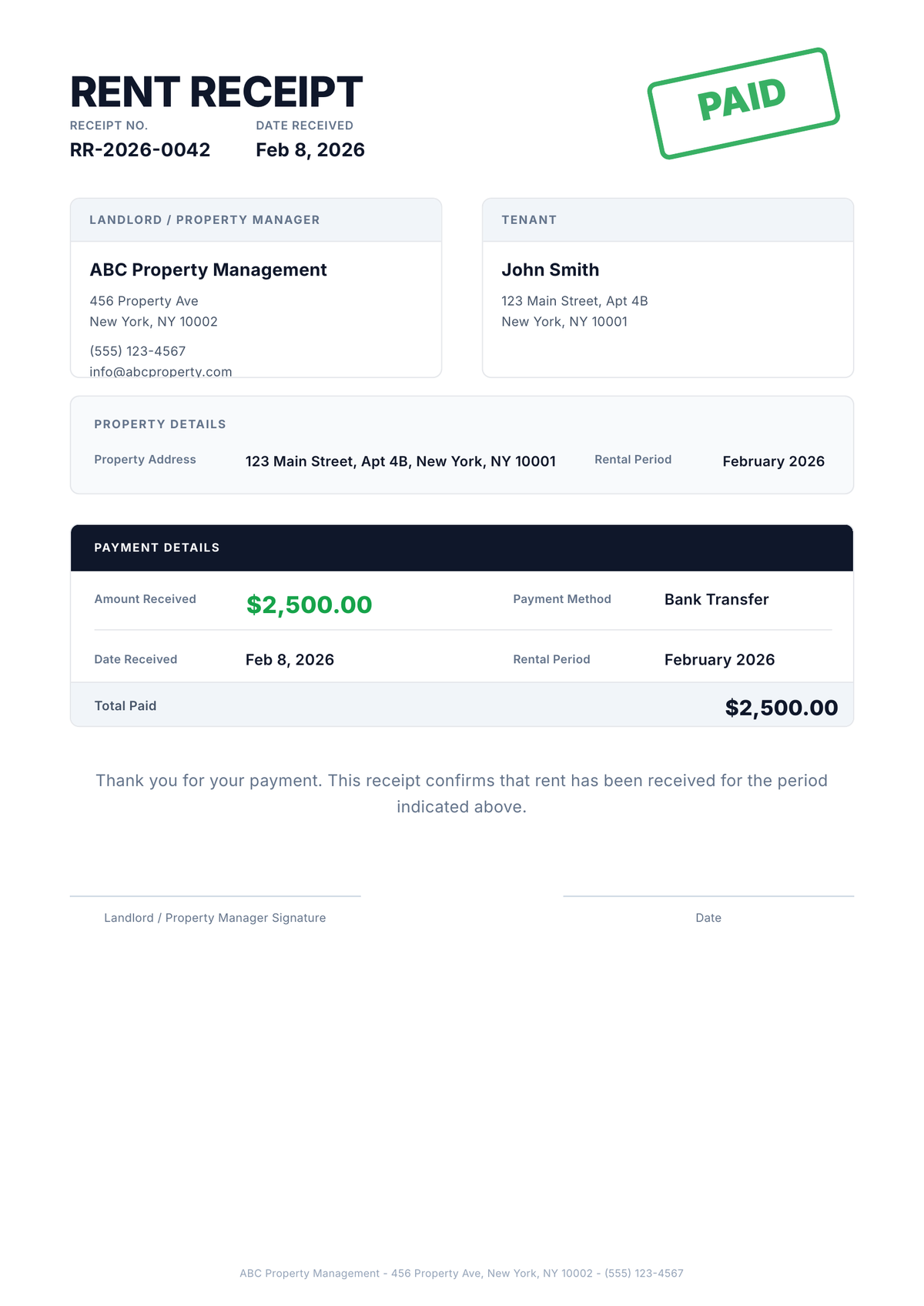 Professional PDF templates for rent receipts, deposit receipts, invoices, and more. Fully customizable and ready for API integration.